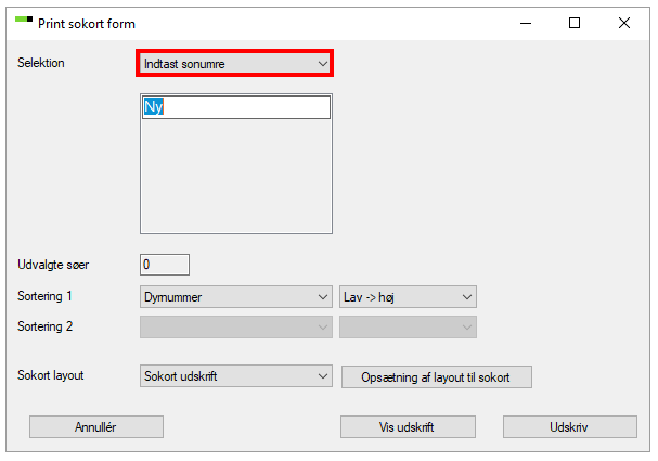 1. Indtast sonumre - Ved hjælp af denne funktion kan du taste sonumrene på de sokort, som du gerne vil have printet