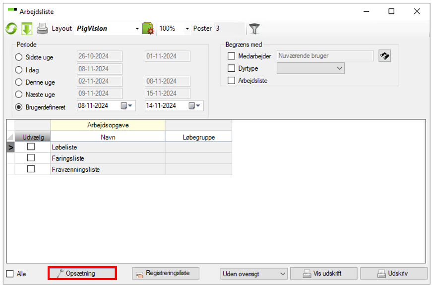 Når du åbner arbejdslister i PigVision er der nogle standard arbejdslister på forsiden i vinduet. Men der er mange flere bagved, som du kan gå ind og aktivere.