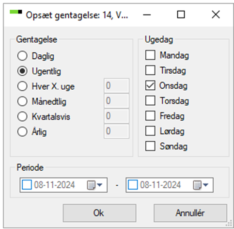 Vælg hvor ofte du vil kunne udskrive vaccinationslisten, fx dagligt eller ugentlig og i det tilfælde hvilken dag(e) det skal være. Derudover kan du også indtaste en periode, som arbejdslisten skal laves over. Klik "Ok" når det er korrekt opsat.