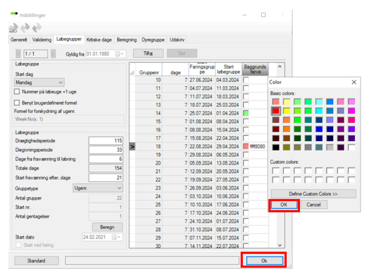 Klik i kolonnen "Baggrundsfarve" ud for den løbegruppe, du ønsker at give en farve og et farvekort vises. Vælg farven og klik "Ok".