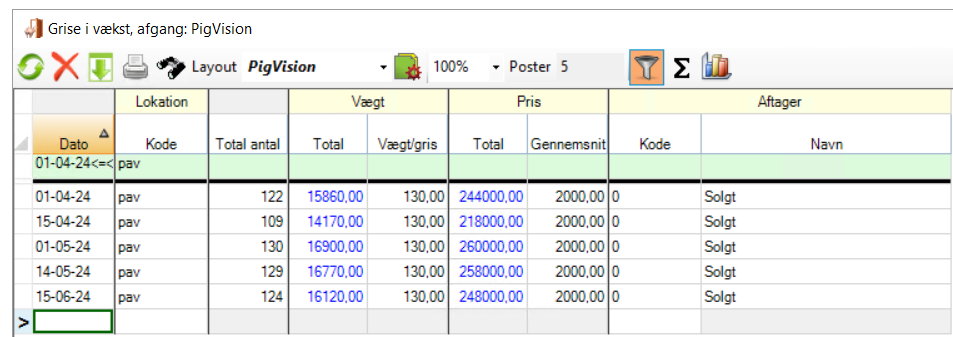 I "Grise i vækst" - "Afgang" opsættes et filter for 2. kvartal i "Dato". Du kan nu se 5 registreringer fra "pav" lokationen.