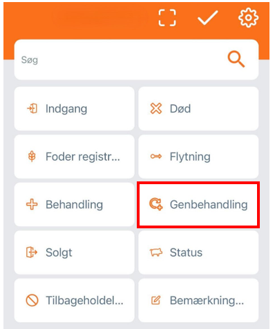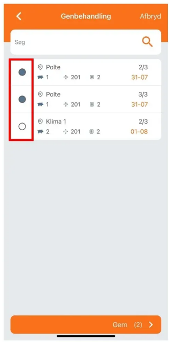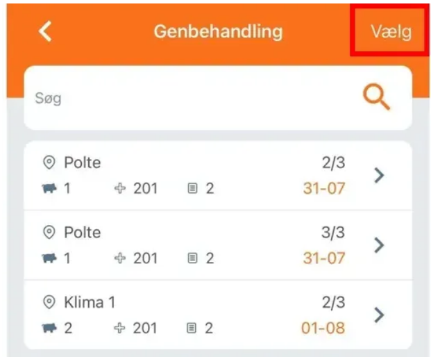 For at registrere genbehandlinger, kan du enten trykke på den specifikke genbehandling eller du kan vælge at registrere flere genbehandlinger på én gang, ved at trykke på "Vælg" i højre hjørne.