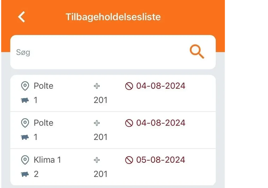 På listen ser du lokationen samt hvor mange dyr, der er tilbageholdt på denne. Den sidste tilbageholdelsesdato vises på listen med rød. Når denne dato er udløbet, vil linjen forsvinde fra listen.