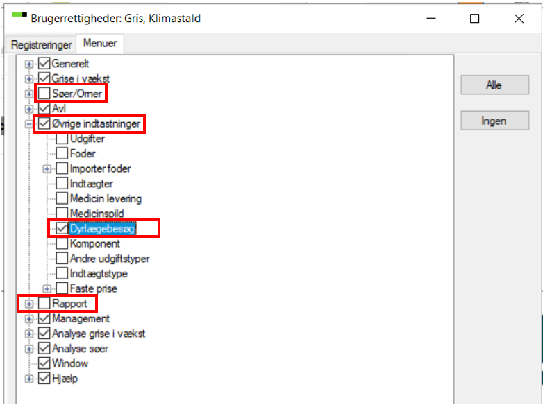 Et vindue åbnes og under "Registreringer" - "Rettighed" er det muligt at opsætte rettighederne for menuerne.