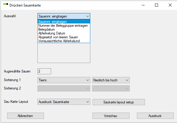 Wenn Sie mehrere Sauen-Karten drucken möchten, können Sie die Funktion „Sauen-Karte drucken” unter der Registerkarte „Sauen/Eber” verwenden. Sie können verschiedene Optionen aus dem Dropdown-Menü auswählen.