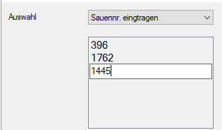 1. Sauen-Nummern eintragen. Hier können Sie eine Reihe von Sauen-Karten ausdrucken, indem Sie die Sauen-Nummern eingeben und anschließend die Eingabetaste drücken.