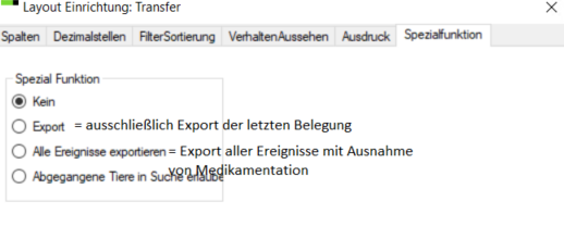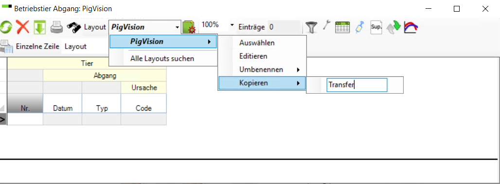 Gehen Sie zum Untermenü „Abgang“ unter dem Menü „Sauen/Eber“ und erstellen Sie eine Kopie des Standardlayouts „PigVision“ und nennen Sie es „Transfer“