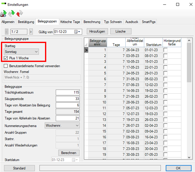 Wenn die Beleggruppen am Sonntag beginnen, muss einen Haken in „Plus 1 Woche“ gesetzt werden.