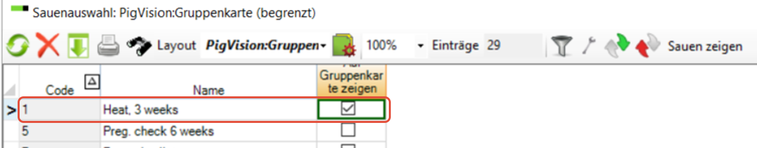 Es ist möglich, Ihrer Gruppenkarte Spalten mit erwarteter Abferkelung, Brunst 3 Wochen und Trächtigkeitstest usw. hinzuzufügen.