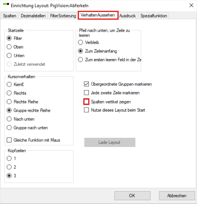 In den Layout-Einstellungen können Sie die Registerkarte „Verhalten und Darstellung“ auswählen, das Häkchen bei „Spalten vertikal anzeigen“ entfernen und auf „OK“ klicken.