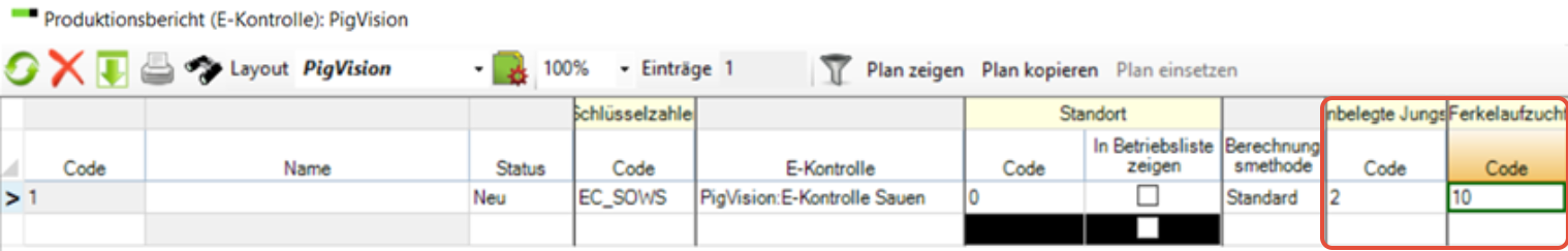Nachfolgend sehen Sie die Einrichtung einer E-Kontrolle für Sauen mit Jungsauen und Ferkelaufzucht - Standort 2 und 10
