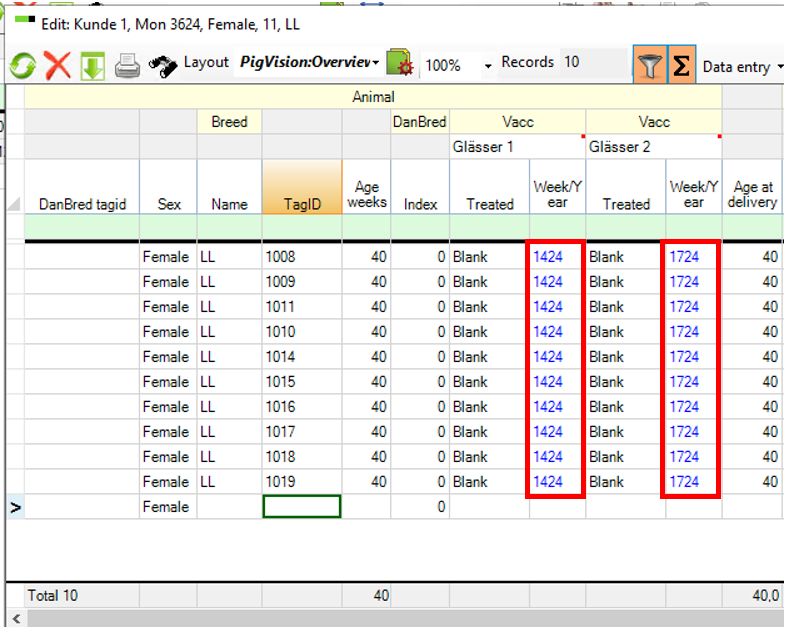 Sobald die Tiere zum Verkauf hinzugefügt wurden, wird die Woche, in der die Tiere geimpft wurden, automatisch berechnet. Die blauen Zahlen zeigen an, dass es sich um Wochen handelt, die PigVision berechnet hat. Es ist möglich, manuell hinzuzufügen oder zu bearbeiten, indem Sie den Wert in den Spalten überschreiben.