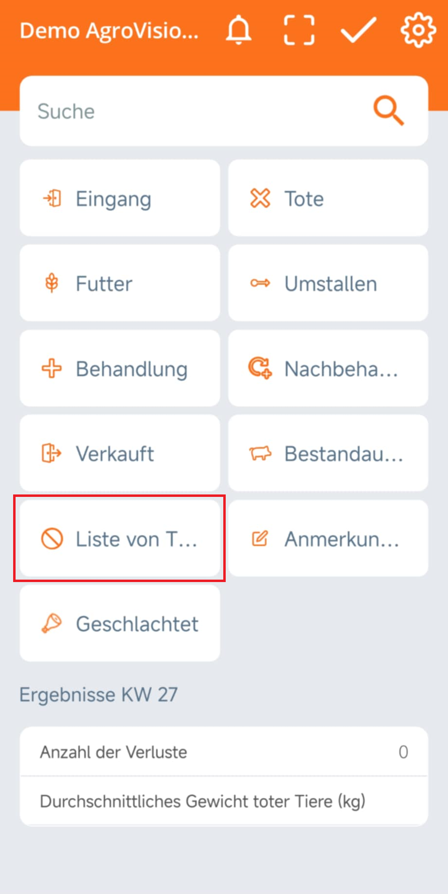 Gehen Sie auf dem Startbildschirm auf "Liste von Tieren mit Wartezeit“.