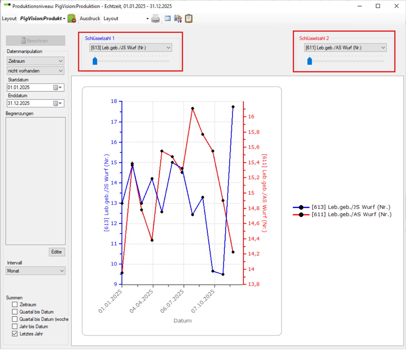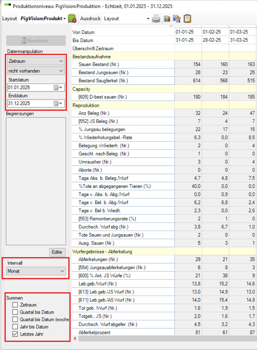 Gehen Sie zu „Auswertung Sauen“ - „Produktionsniveau Sauen“.