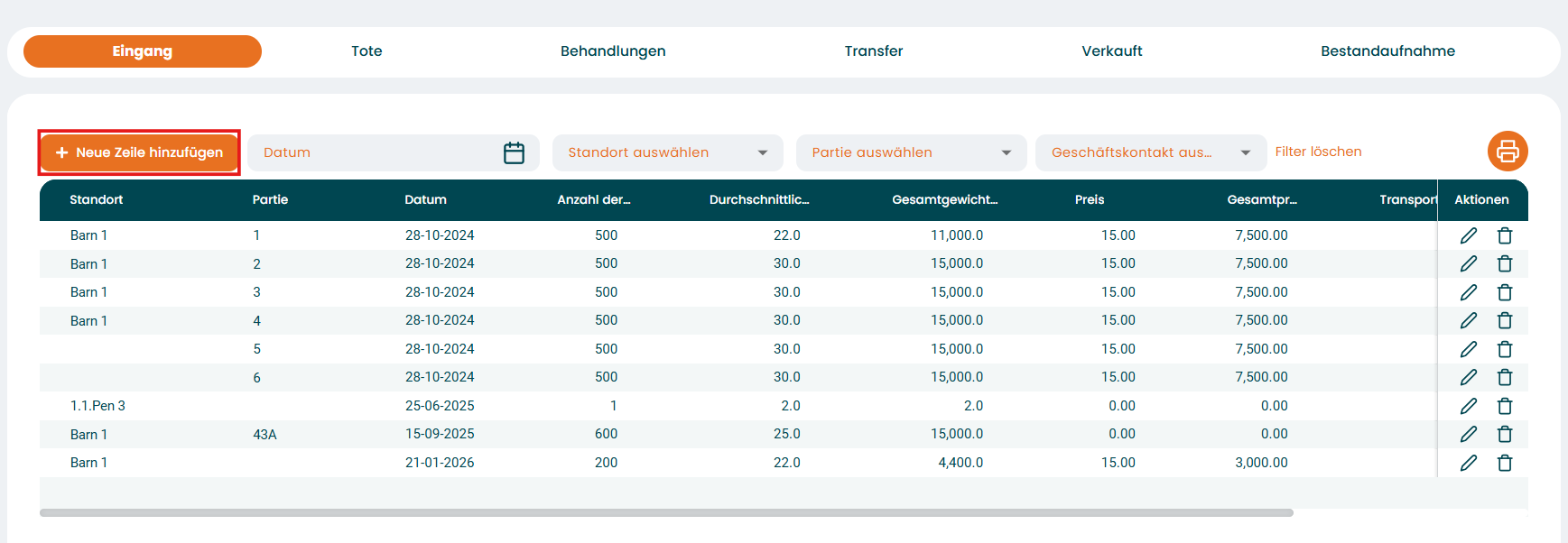 - Sie sehen dann alle verfügbaren Aktionen. Um neue Tierdaten einzugeben, wählen Sie "Eingang" und klicken Sie dann auf die Schaltfläche "+ Neue Zeile hinzufügen" in der linken oberen Ecke der Tabelle: