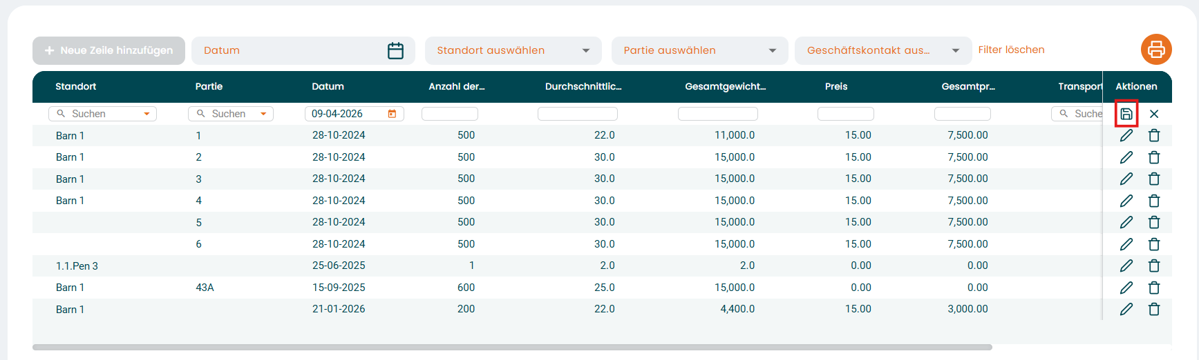 - Es wird nun eine neue Zeile erstellt, in die Sie alle Informationen zu diesem neuen Eintrag eingeben können (Ort, Charge, Datum, Anzahl der Schweine, Durchschnittsgewicht, Gesamtgewicht, Preis, Gesamtpreis und woher sie erworben wurden). Sobald Sie alle Informationen eingegeben haben, klicken Sie auf das Symbol "Speichern", das Sie am Ende der neu erstellten Zeile sehen