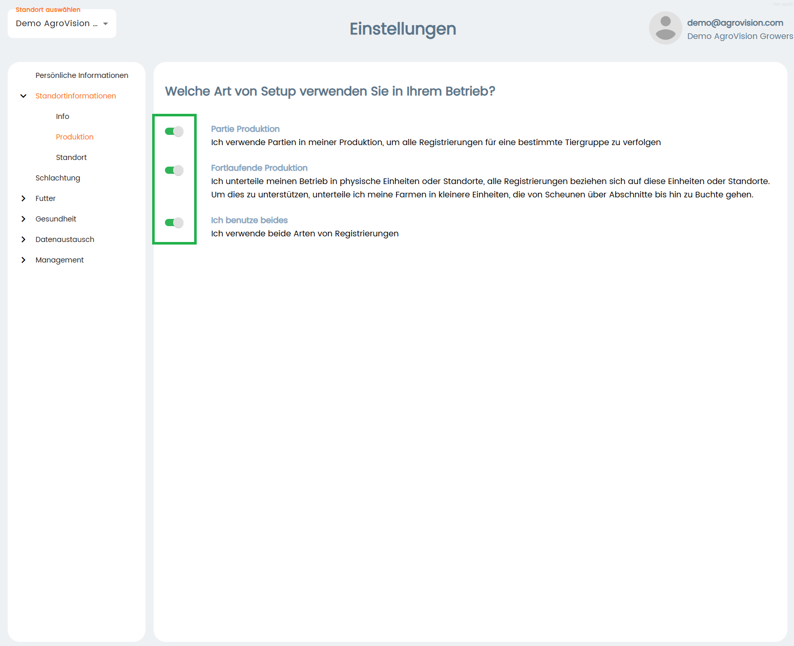 Danach wählen Sie Ihre Produktionsart. Sie können die Chargenproduktion wählen, wenn Ihr Betrieb in Chargen arbeitet (all in/all out). Sie können die kontinuierliche Produktion wählen, wenn Sie einen kontinuierlichen Fluss von Tieren haben, der nicht in verschiedene Chargen aufgeteilt ist oder Sie können "Ich benutze beides“ wählen, wenn Sie mit einem kontinuierlichen Fluss arbeiten, aber die Tiere auch in Chargen trennen.