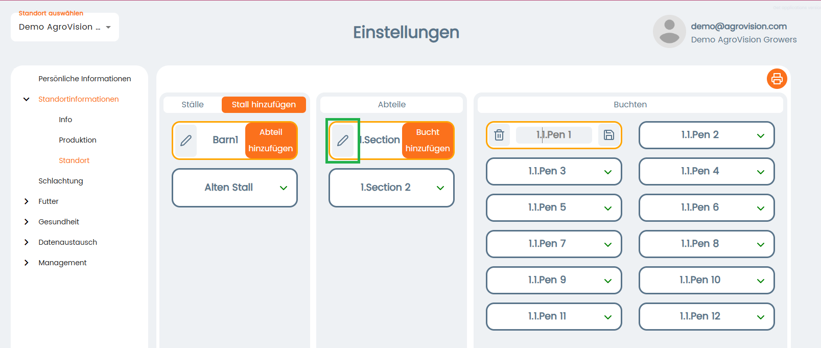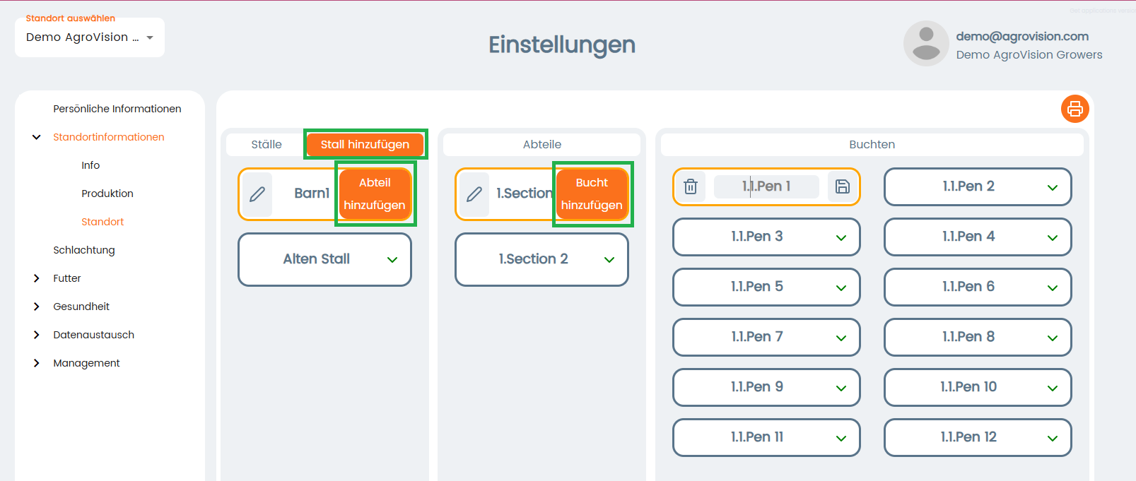 Wenn die Option "Fortlaufende Produktion“ aktiviert ist, können Sie im Abschnitt "Standort" im Menü "Standortinformationen“ verschiedene Standorte innerhalb Ihres Standorts erstellen. Es gibt 3 Ebenen der Hierarchie. Die erste ist "Ställe“, Sie können so viele Ställe wie Sie wollen erstellen, indem Sie auf "Neuer Stall“ klicken. Innerhalb jedes Stalls können Sie "Abteile“ erstellen, indem Sie auf die Schaltfläche "Abteil hinzufügen“ klicken, um neue Abschnitte hinzuzufügen. Schließlich können Sie innerhalb jeder Sektion "Buchten“ erstellen, indem Sie auf die Schaltfläche "Bucht hinzufügen“ klicken.