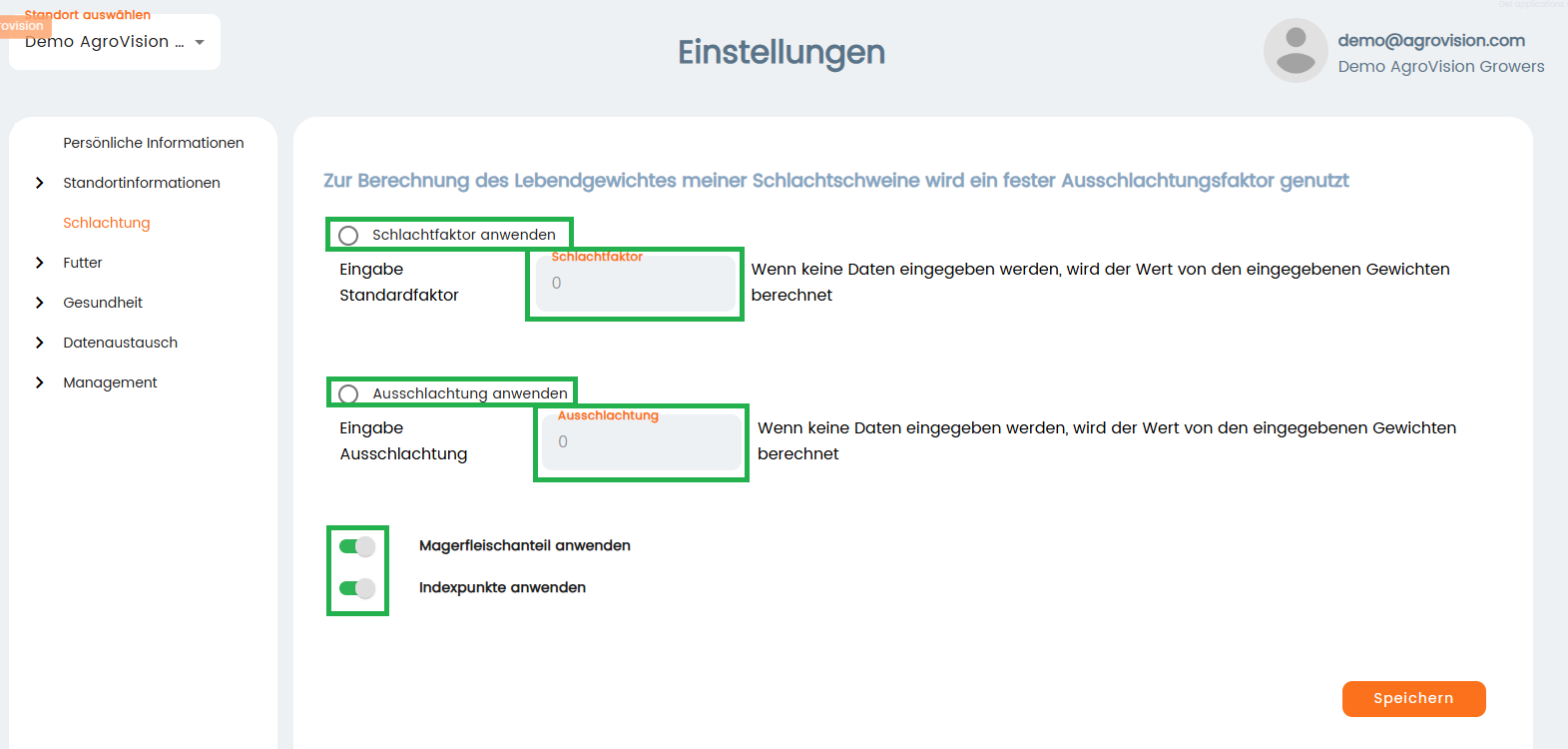 - Schlachtung: In diesem Abschnitt können Sie den Schlachtfaktor einstellen, den AgroVision Growers bei den Berechnungen anwendet. Sie können die Option wählen, indem Sie sie aktivieren und die Zahl eingeben, die als Schlachtfaktor angewendet werden soll. Sie können auch wählen, ob Sie den "Magerfleischanteil“ und die "Indexpunkte“ aktivieren/deaktivieren möchten.