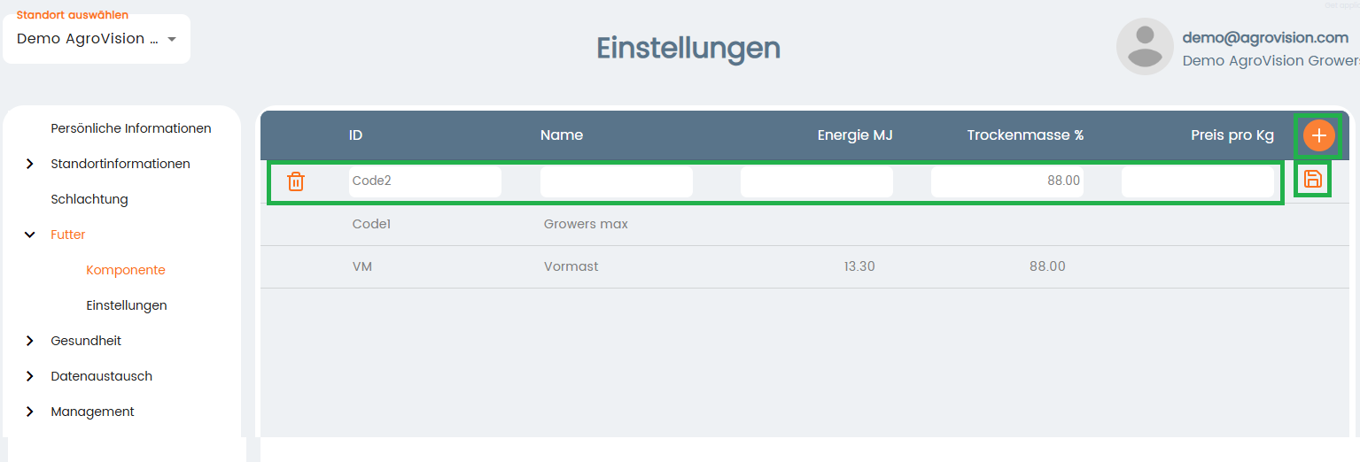 - Futter: Hier können Sie alle verschiedenen Arten von Futter registrieren, die Sie auf dem Bildschirm "Komponente“ verwenden möchten. Um einen neues Futter zu registrieren, klicken Sie auf das "+“-Symbol in der oberen rechten Ecke der Tabelle und geben Sie die Informationen des Futters ein, dann klicken Sie auf das Symbol speichern.