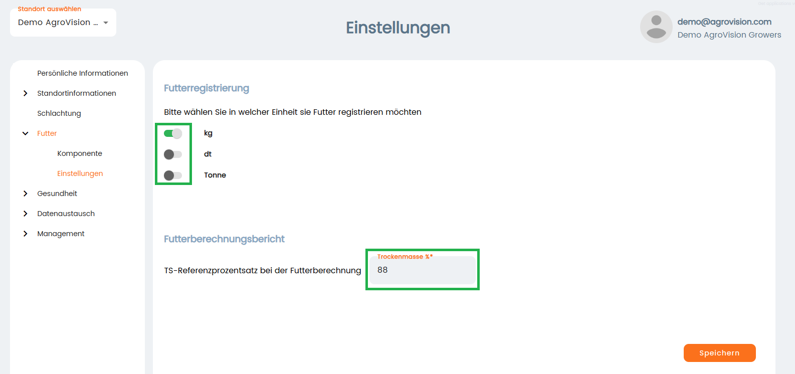 - Der nächste Abschnitt des Menüs "Futter" ist "Einstellungen". Hier legen Sie fest, welche Einheit Sie verwenden möchten und wie viel Prozent der Trockenmasse zugeführt werden soll. Sie können die gewünschte Option aktivieren, indem Sie einfach darauf klicken, dann wird die Option in grün angezeigt. Für den Prozentsatz der Trockenmasse geben Sie einfach die Zahl ein und klicken auf "Speichern".