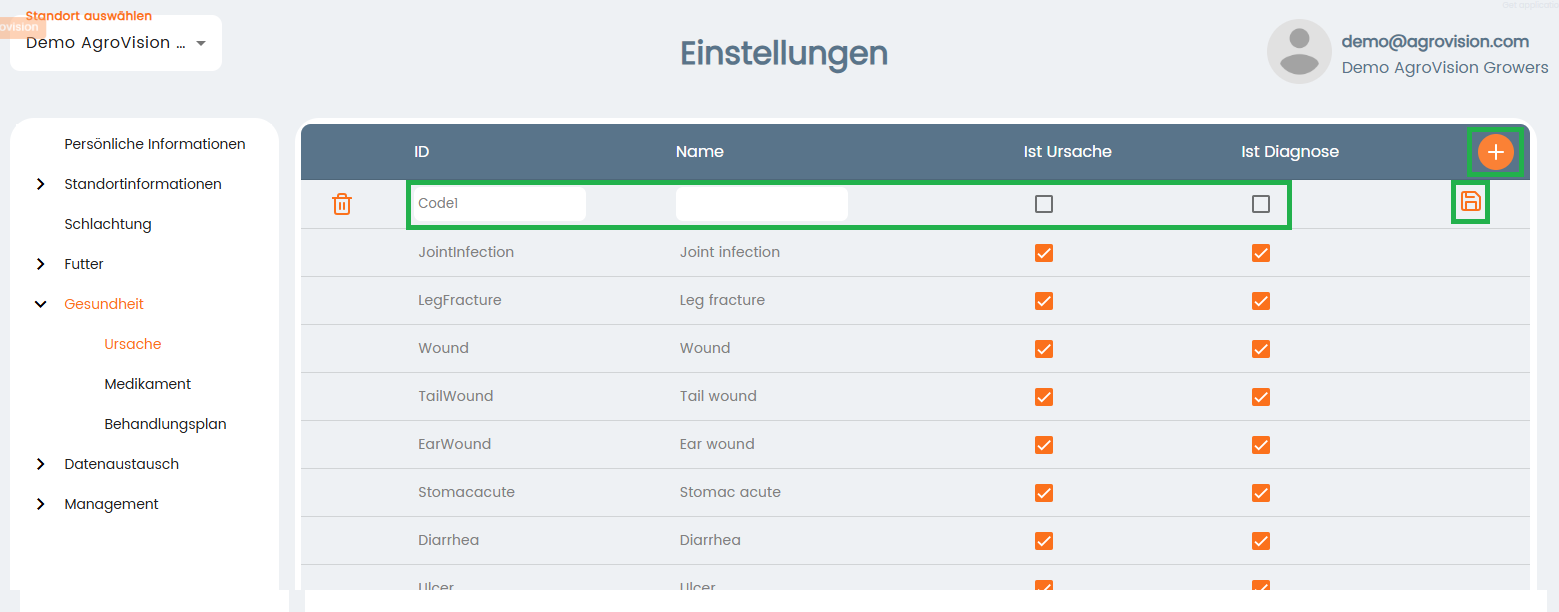 - Gesundheit: Der erste Abschnitt des Gesundheitsmenüs ist "Ursache“. Hier können Sie alle Krankheiten eintragen, die Sie in die App eingeben möchten. Um eine neue Ursache einzutragen , klicken Sie auf das "+“-Symbol in der oberen rechten Ecke der Tabelle und geben Sie die Informationen zur Ursache ein, dann klicken Sie auf das Speichersymbol. Sie können entscheiden, ob die Ursache, die Sie hinzufügen, eine Ursache, eine Diagnose oder beides ist.