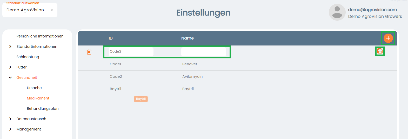 Der nächste Abschnitt ist "Medikament", wo Sie alle Medikamente, die Sie verwenden werden, eintragen können. Klicken Sie auf das "+"-Symbol in der oberen rechten Ecke der Tabelle und geben Sie die Informationen über das Medikament ein.