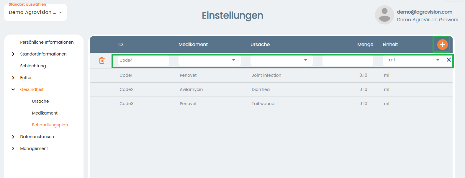 Im Abschnitt „Behandlungsplan“ können Sie verschiedene Behandlungspläne erstellen, in denen Sie die Ursachen und die zuvor eingetragenen Medikamente angeben. Welche Ursache liegt vor, welches Medikament für diese Ursache ist zu verwenden, wie viel von diesem Medikament ist zu verwenden, wie viele Tage die Behandlung dauern wird und wie viele Tage die Entwöhnungsphase für diesen speziellen Plan beträgt. Um einen neuen Plan zu erstellen, klicken Sie auf das Symbol „+“ in der oberen rechten Ecke der Tabelle und geben Sie die erforderlichen Informationen ein.