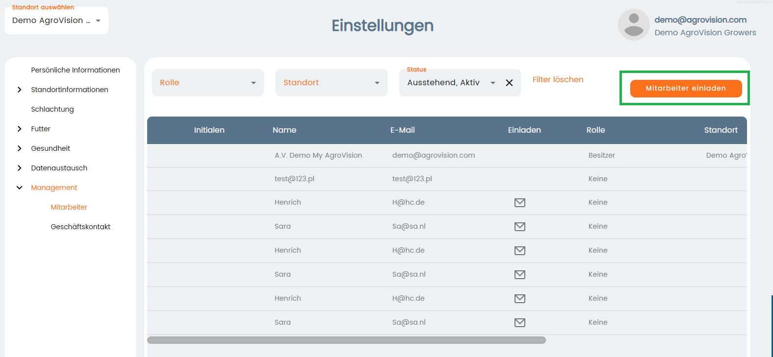 - Management: Der Bereich „Mitarbeiter“ in diesem Menü dient dazu, neue Mitarbeiter einzuladen und zu registrieren und ihnen Rechte zur Nutzung der App zu erteilen. Sie können einen neuen Mitarbeiter erstellen/einladen, indem Sie auf die Schaltfläche "Mitarbeiter einladen“ klicken. Geben Sie seine/ihre E-Mail-Adresse ein und er/sie erhält eine Benachrichtigung, um sein/ihr Konto zu aktivieren. Bis zur Aktivierung des Kontos wird der Status des neuen Mitarbeiters auf "Ausstehend“ gesetzt. Sobald er die Aktivierung abgeschlossen hat, wird sein Status auf "Aktiv“ gesetzt. Hier können auch Mitarbeiter gelöscht werden.