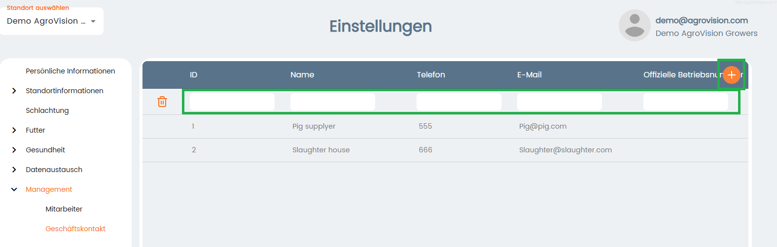 Im Abschnitt "Geschäftskontakt" können Sie Unternehmen wie Schweinelieferanten oder Schlachthöfe eintragen. Um ein neues Unternehmen zu hinzuzufügen, klicken Sie auf das "+"-Symbol in der oberen rechten Ecke der Tabelle und geben Sie die erforderlichen Informationen ein.
