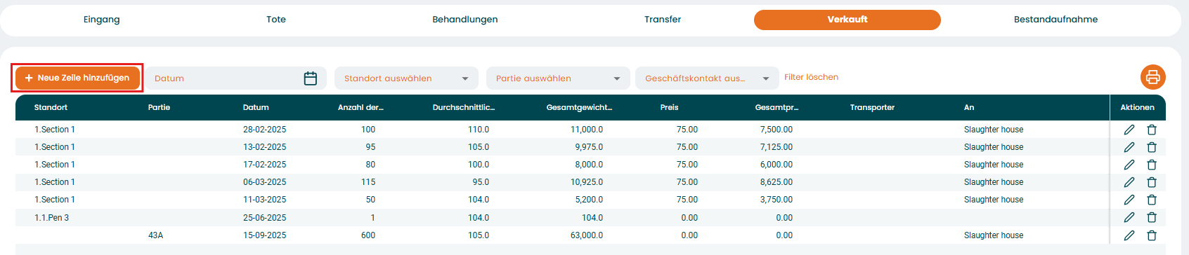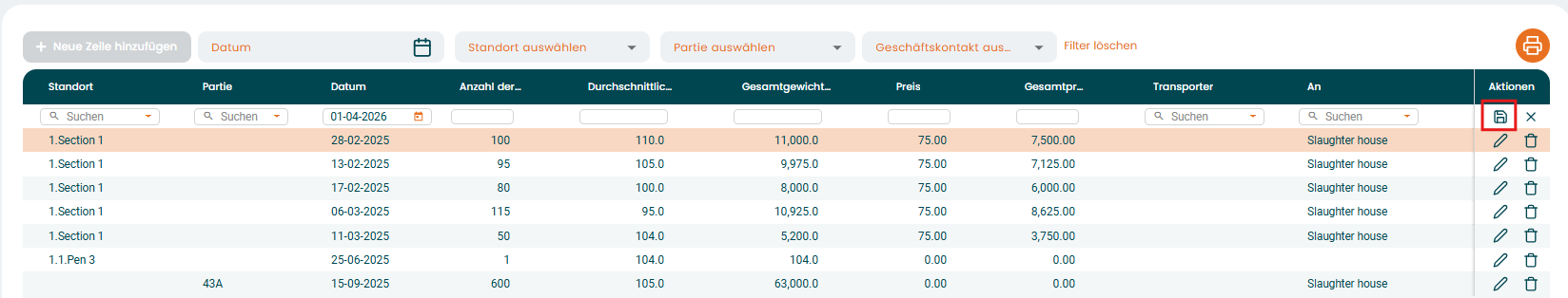 Wenn Sie eine neue Erfassung vornehmen möchten, verwenden Sie die Schaltfläche „+ Neue Zeile hinzufügen“ in der oberen linken Ecke der Tabelle. In diesem Fall erfassen wir verkaufte Tiere.