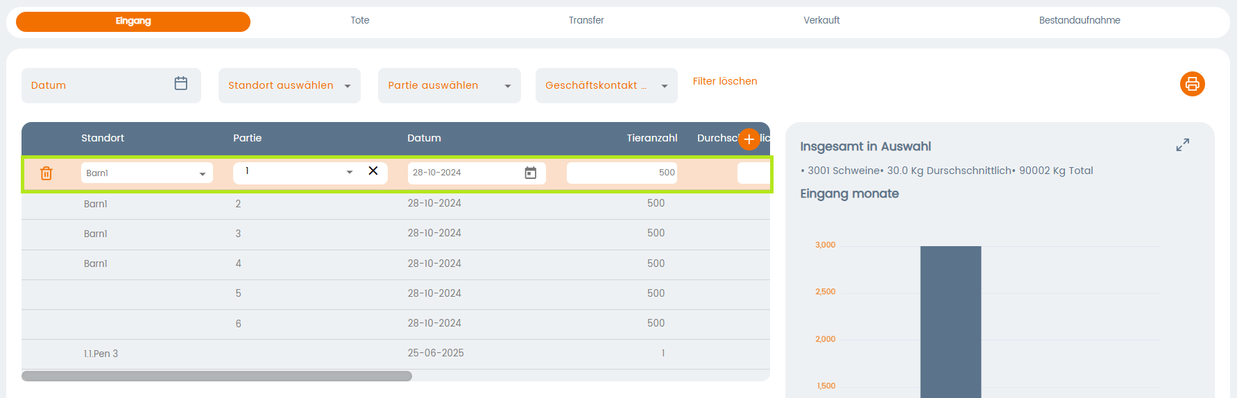 Wenn Sie eine bestehende Registrierung löschen möchten, gehen Sie zu der Tabelle, in der die Registrierung, die Sie bearbeiten möchten, gespeichert ist. In diesem Beispiel löschen wir eine Eingangsregistrierung. Also gehen wir zu „Aktionen“ und wählen „Eingang“, um alle Einträge zu sehen. Dort klicken wir in die Zeile, die wir löschen wollen, und sie wird automatisch bearbeitbar.