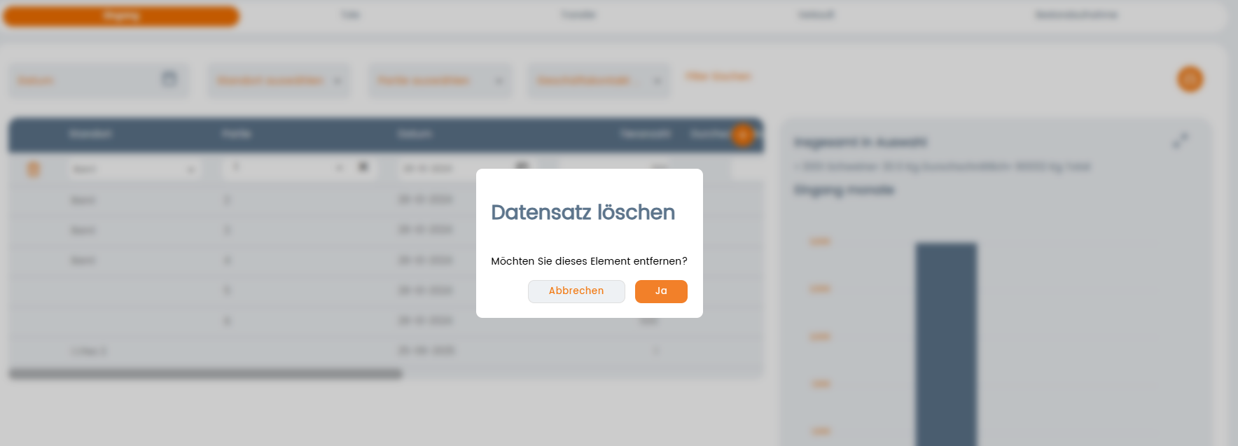 Wenn Sie darauf klicken, erscheint eine Popup-Meldung, in der Sie gefragt werden, ob Sie den Datensatz löschen möchten. Wenn Sie auf "Ja" klicken, wird der Datensatz gelöscht und Sie können ihn nicht wiederherstellen. Wenn Sie auf "Abbrechen" klicken, wird der Löschvorgang abgebrochen und die Daten bleiben in der Web-app.
