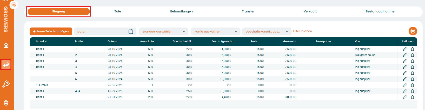 Wenn Sie eine bestehende Registrierung löschen möchten, gehen Sie zu der Tabelle, in der die Registrierung, die Sie bearbeiten möchten, gespeichert ist. In diesem Beispiel löschen wir eine Eingangsregistrierung. Also gehen wir zu „Ereignis“ und wählen „Eingang“, um alle Einträge zu sehen. Dort klicken wir in die Zeile, die wir löschen wollen, und sie wird automatisch bearbeitbar.