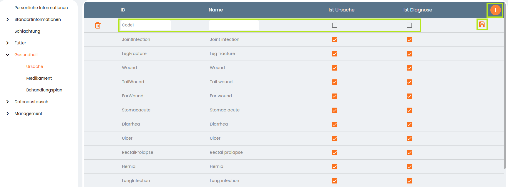 Der erste Abschnitt des Gesundheitsmenüs ist "Ursache“. Hier tragen Sie alle Krankheiten ein, die Sie in die App eingeben möchten. Um eine neue Ursache einzugeben, klicken Sie auf das "+“-Symbol in der oberen rechten Ecke der Tabelle und geben Sie die Informationen zur Ursache ein, dann klicken Sie auf das Symbol Speichern. Sie können entscheiden, ob die Ursache, die Sie eingeben, eine Ursache, eine Diagnose oder beides ist.