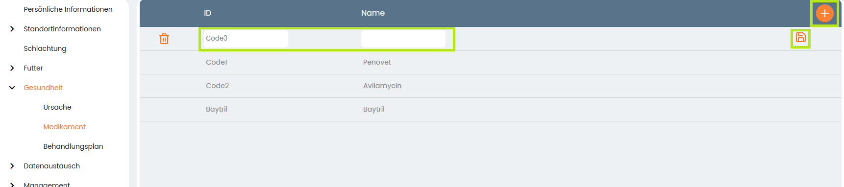 Der nächste Abschnitt ist "Medikament", wo Sie alle Medikamente, die Sie verwenden werden, einfügen können. Klicken Sie auf das "+"-Symbol in der oberen rechten Ecke der Tabelle und geben Sie die Informationen über das Medikament ein.