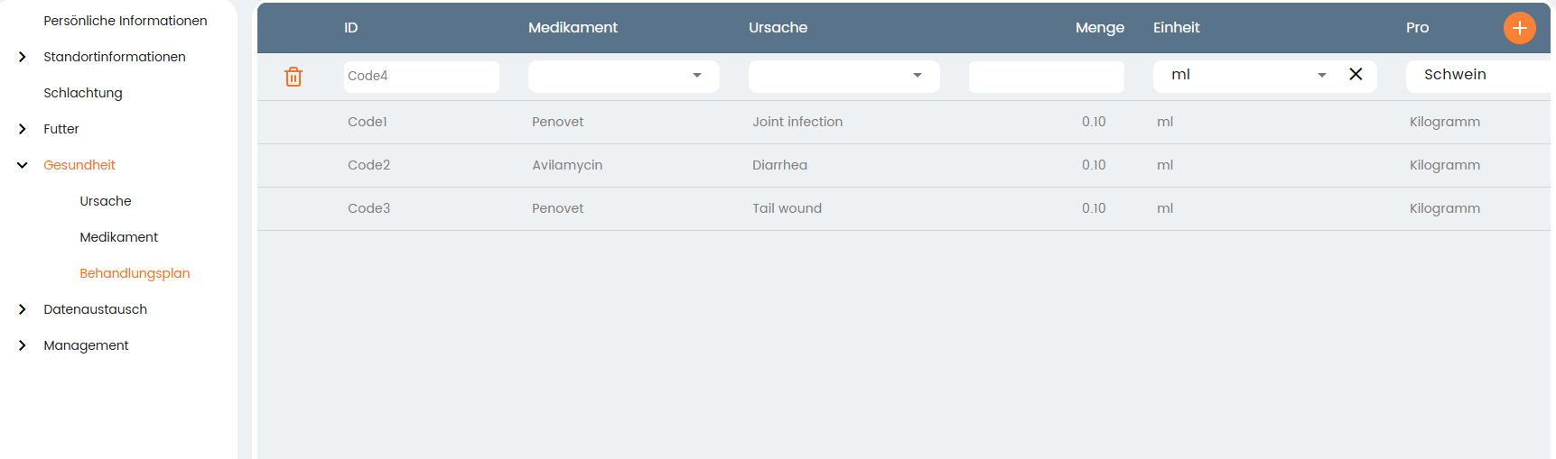 Im Abschnitt "Behandlungsplan" können Sie mit den zuvor eingegebenen Ursachen und Medikamenten Behandlungspläne erstellen. Wählen Sie eine Ursache und das Medikament welches verwendet werden soll, die Menge des Medikaments, wie viele Tage die Entwöhnungsphase für diesen speziellen Plan beträgt. Um einen neuen Plan zu erstellen, klicken Sie auf das "+"-Symbol in der oberen rechten Ecke der Tabelle und geben Sie die erforderlichen Informationen ein.
