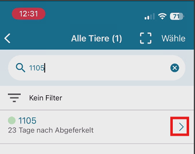 Um tote Saugferkel in der mobilen App zu registrieren, öffnen Sie das Menü „Alle Tiere“ auf dem Hauptbildschirm. Suchen Sie eine Sau, indem Sie sie scannen oder eine Sauennummer eingeben, unter der tote Ferkel registriert werden sollen: