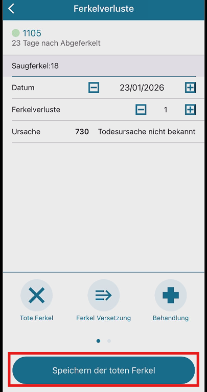 Geben Sie das Datum des Ereignisses, die Anzahl der toten Ferkel und ggf. die Todesursache ein. Klicken Sie dann unten im Fenster auf „Speichern der toten Ferkel“.