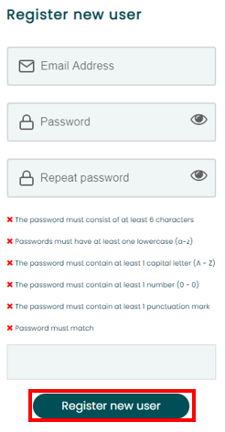- If you have clicked "Register new user", you must now enter your email address and a password of your choice. Then click "Register new user"