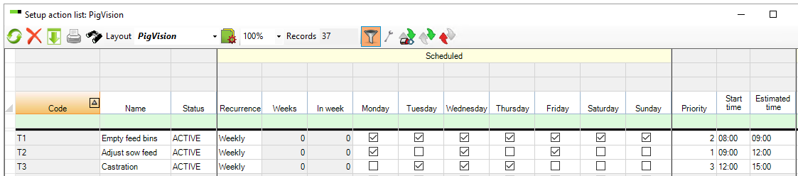 T2 "Adjust sow feed" is setup to be done on Mondays, Wednesdays and Fridays.