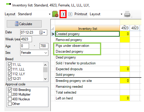 When you calculate a new “Inventory list” you click the red marked and two new lines will appear.