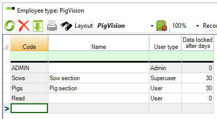 In this example, 2 additional employee types have been created: "Pigs" and "Sows". "Pigs" only have access to the menus in PigVision that relate to piglets and "Sows" only have access to the menus in PigVision that relate to sows.
