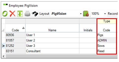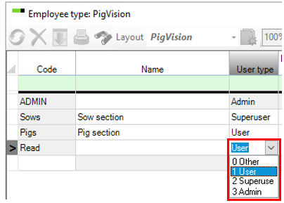 As a starting point, "ADMIN" is the default user type and always has full rights over the entire PigVision. AgroVision can add "Read" if a consultant needs "view access". If the user is to have rights to everything in PigVision, his or her employee type must be "ADMIN".