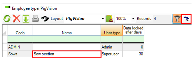 When the employee type is set up, it is possible to lock the possibility of registering data after the specified number of days. Here you enter how many days it takes until data is locked, i.e. in this example, users with the employee types "Sows" and "Pigs" cannot edit data after 30 days: