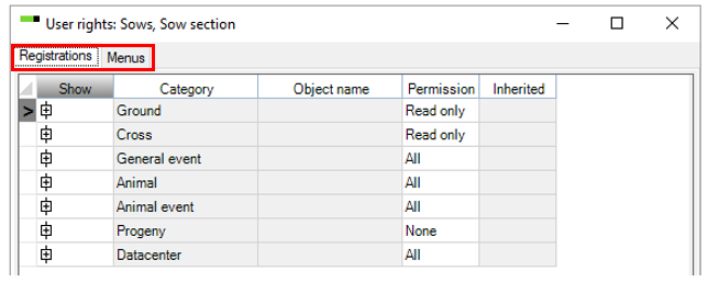 Here you set up which user rights the current employee type should have. You can set up user rights for registrations and menu items, respectively. Since you can do it for both, you can, for example, choose to allow you to see a menu item without having rights to registrations in it. Therefore, you decide on the two different parts in the two tabs "Registrations" and "Menus":