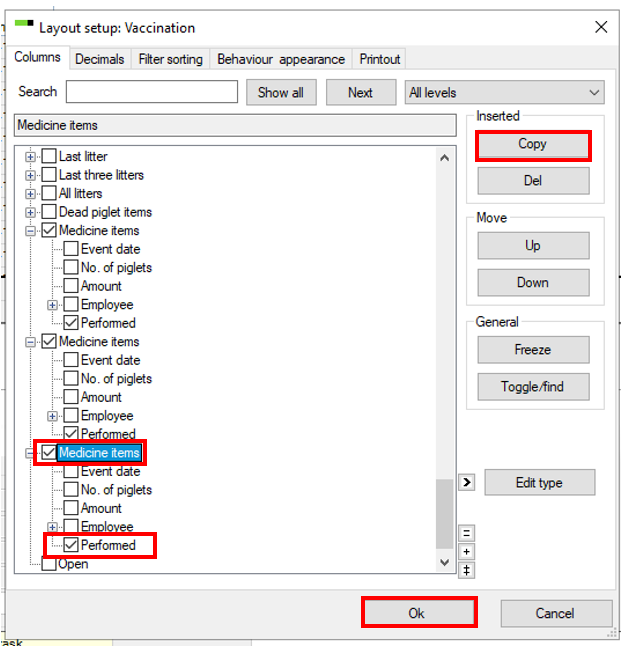 Add "Medicine items" and "Performed" by setting checkmark in boxes. When you click on medication, you can choose to add more treatments to the same work list if you click "Copy". It is possible to make as many copies as you want.