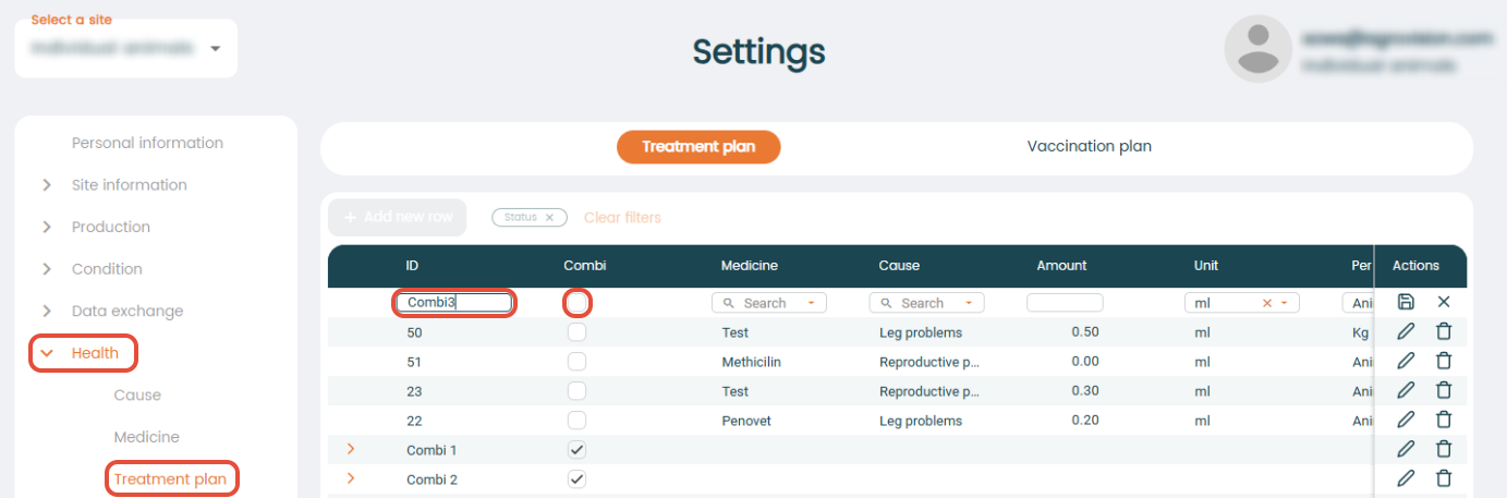Create a new treatment plan by clicking on "+ Add new row". Give the treatment plan an ID and check mark the "Combi" column to combine the treatment plans.