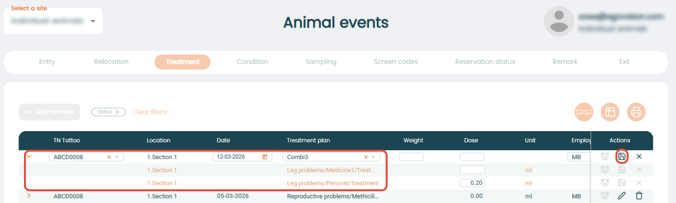 Go to "Animal events" - "Treatment" and press "+ Add new row" to start an animal treatment. Simply fill in the animal information needed in the different columns.