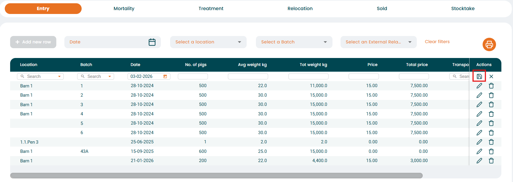 - A new row is now created so you can enter all the information related to this new entry of animals (location, batch, date, number of pigs, average weight, total weight, price, total price and from where they have been acquired). Once you enter all the information, press the "save" icon you see at the end of the new row created